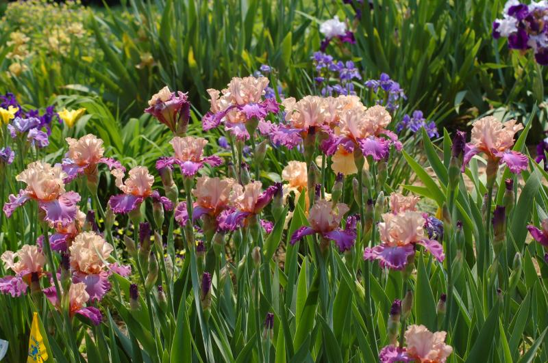 Don and Ginny met at their local iris society, the Chesapeake and Potomac Iris Society, that is located in northern Virginia. We met at an iris auction, he outbid me on some irises but I got them all back when I married him several years later. We moved to Cross Junction, VA in 1994, where we now grow a large collection of irises on our 5 acres in zone 6, located on the Allegheny highlands west of the Shenandoah Valley. Below is a clump of 'Little John' one of our first hybrid introductions. Grown well, it can have up to 11 buds and each flower lasts 4 to 5 days.